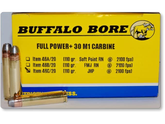 For years, customers have asked for full-power 30 M1 Carbine loads. Buffalo Bore calls these loads “Full Power+” instead of +P, because they are not technically +P as they are all within the SAAMI max. average pressure of 40,000 CUP, but they are much more powerful than ordinary run-of-the-mill M1 Carbine ammo. ANY/ALL M1 chambered carbines that are in normal operating condition will safely fire these loads, as they are operating within SAAMI specs. This ammo is designed to be useful in defending one’s life or in harvesting game up to the size of 200 lb. critters. This ammunition is new production, non-corrosive, in boxer primed, reloadable brass cases.