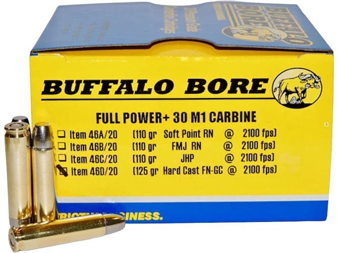 For years, customers have asked for full-power 30 M1 Carbine loads. Buffalo Bore calls these loads “Full Power+” instead of +P, because they are not technically +P as they are all within the SAAMI max. average pressure of 40,000 CUP, but they are much more powerful than ordinary run-of-the-mill M1 Carbine ammo. ANY/ALL M1 chambered carbines that are in normal operating condition will safely fire these loads, as they are operating within SAAMI specs. This ammo is designed to be useful in defending one’s life or in harvesting game up to the size of 200 lb. critters. This ammunition is new production, non-corrosive, in boxer primed, reloadable brass cases.